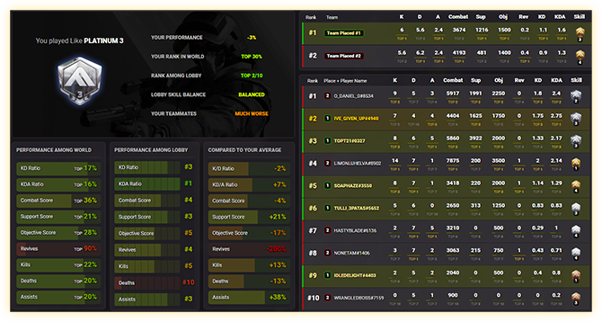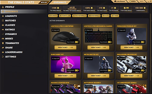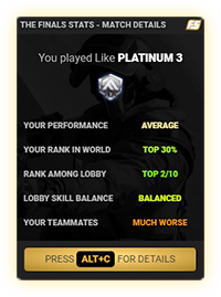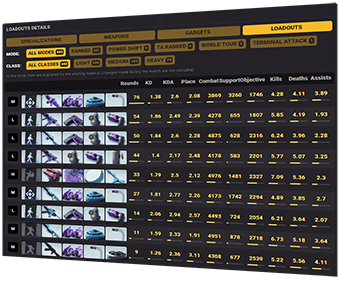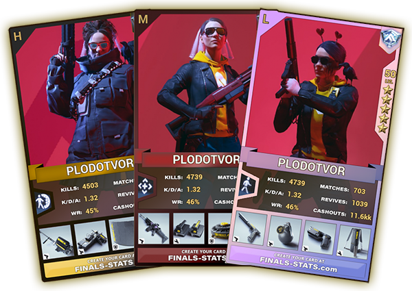Track comprehensive Stats for The Finals with our App. Impressive amount of features: Profile Stats, Loadouts, Weapons, gadgets, Ranked, Matches, Classes, Friends, Ratings, Dynamics, Modes, Teammates, Combinations, Skins Tracker, Profile Card and many more